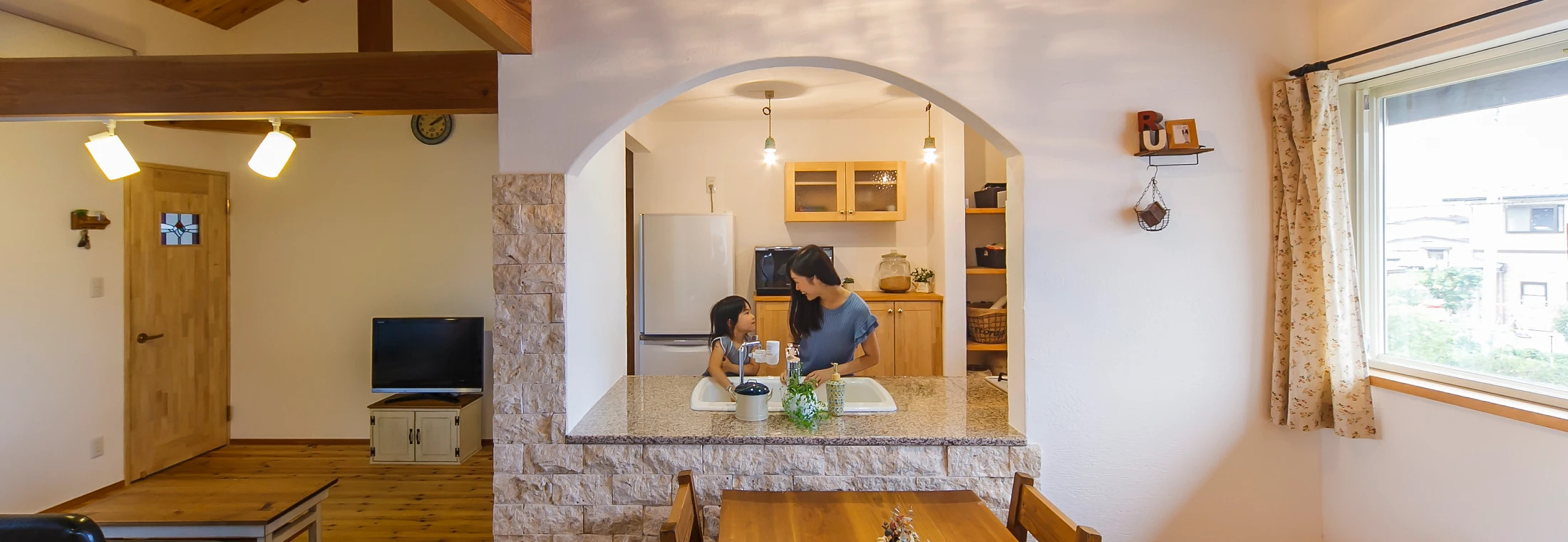表情豊かな自然素材を使い、職人が手作りする無添加住宅は、世界に一つだけの住まい。しっくいの壁や造作キッチンなどは手仕事ならではの深みが、住まいに豊かな表情を与えます。