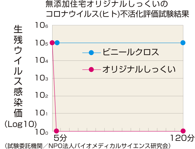 今回は、消石灰が主成分の無添加住宅オリジナルしっくいにヒト・コロナウイルス(HCoV-229E)を付着させて試験を行いました。ウイルスはオリジナルしっくいに付着させてから5分後には、完全に死滅するという結果になりました。この試験結果から、エンベロープを持つ他のエンベロープウイルスにも同様の効果が期待できるものと考えています。(今回の試験は、新型コロナウイルスと遺伝子情報が90%合致している「ヒト・コロナウイルス」を用いての試験結果です。)