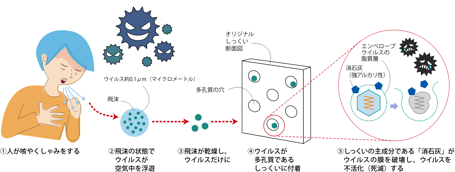 しっくいの主成分である消石灰は、強アルカリ性の水酸化カルシウム(Ca(OH)2)です。この強アルカリ性はタンパク質を分解する性質があるためエンべロープウイルスの周りを囲んでいる脂質層に含まれるタンパク質を破壊し、ウイルスを死滅させることができます。
