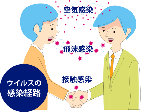 人の咳は1回で約5万個のウイルスが飛び、くしゃみでは1回で約10万個のウイルスが飛びます。飛沫が飛び散る範囲は 約2mと言われています。