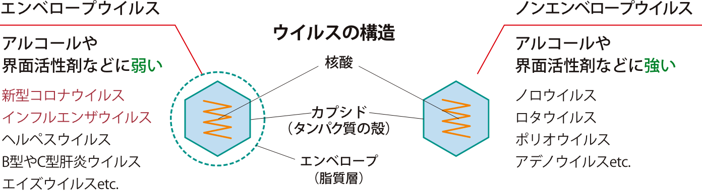 ウイルスには、「エンベロープ」と呼ばれる膜を持つ「エンベロープウイルス」と、膜を持たない「ノンエンベロープウイルス」の2種類が存在します。エンベロープウイルスは、その膜さえ破壊してしまえば、死滅しますが、エンベロープのないウイルス(ノンエンベロープウイルス)は、ダメージを受けにくく、アルコール消毒剤が一般的に効きにくいとされています。